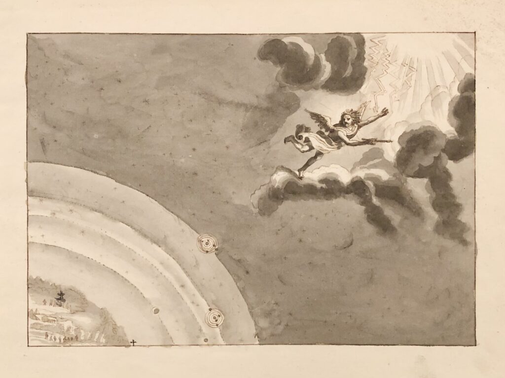 La datation de cette feuille est donnée par leur filigrane, la marque des papetiers hollandais Dirk et Cornelis Blauw, associés en 1750. Cornelis étant décédé en 1762, on peut donc dater les dessins entre 1750 et 1762. Les Pays-Bas ayant exporté leur papier dans l’Europe entière, le dessin n’est pas forcément d’une main hollandaise. Son auteur ne semble pas avoir assimilé les découvertes de Copernic, ni celles de Kepler. La lune, puis apparemment les planètes avec leurs satellites, semblent tourner autour d’une Terre qu’animent des petites figures humaines à côté d’une église. Les orbites sont clairement dessinées, autour de la Terre, puis autour de chaque planète. Des étoiles brillent dans le cosmos. Au sommet, le soleil envoie ses rayons, mais aussi les éclairs de la foudre. Un archange semble le commander, et des nuages forment une atmosphère autour du soleil ! Ces savoureuses naïvetés nous rappellent que les écrits de Copernic, établissant l’héliocentrisme, ont été mis à l’index par l’Eglise jusqu’en… 1835 !