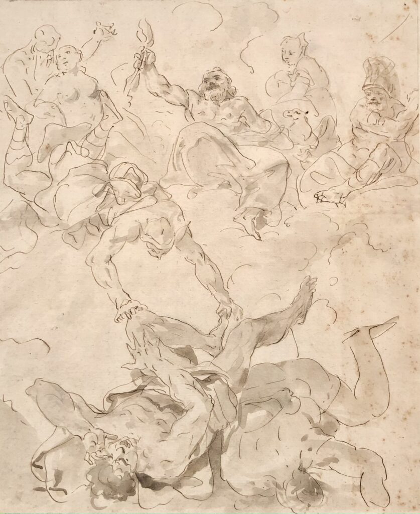École Italienne du début du XVIIIe siècle, Jupiter foudroyant les Titans, encre grise, lavis gris sur papier, 32 x 27,4 cm