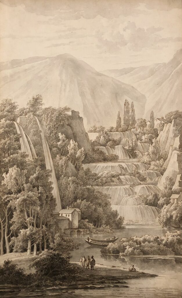 Après une formation d’ingénieur aux Ponts et Chaussées, puis un passage dans l’atelier de Jean-Jacques Lagrenée, Louis-François Cassas part avec le duc de Rohan-Chabot pour un voyage à Naples, puis en Istrie et en Dalmatie (actuelle Croatie). Vingt ans plus tard, il lui est demandé d’y retourner, afin de réaliser une centaine de planches gravées pour illustrer son périple, dans une région peu explorée à la fin du XVIIIe siècle. Notre dessin est semble-t-il la première pensée de la gravure du Victoria & Albert museum , qu’il aurait probablement réalisé à son retour à Rome de son premier voyage, en 1782. Quelques modifications ont été apportées entre temps : les figures qui animent le paysage, les voiles des embarcations, les arbres et arbustes qui occultent tels des coulisses, les différents degrés des eaux bouillonnantes de la cascade… Cette œuvre, en plus de nous offrir un sublime paysage aujourd’hui classé parc national, nous montre comment ce grand voyageur-paysagiste a su associer la topographie documentaire à la qualité artistique.