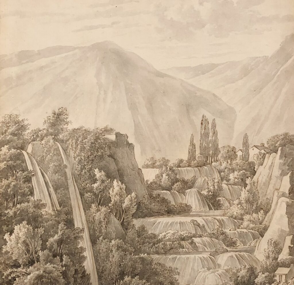 Louis-François Cassas (1756 – 1827), Les chutes de Kerka (détail), encre brune, lavis gris 40,2 x 24,8 cm