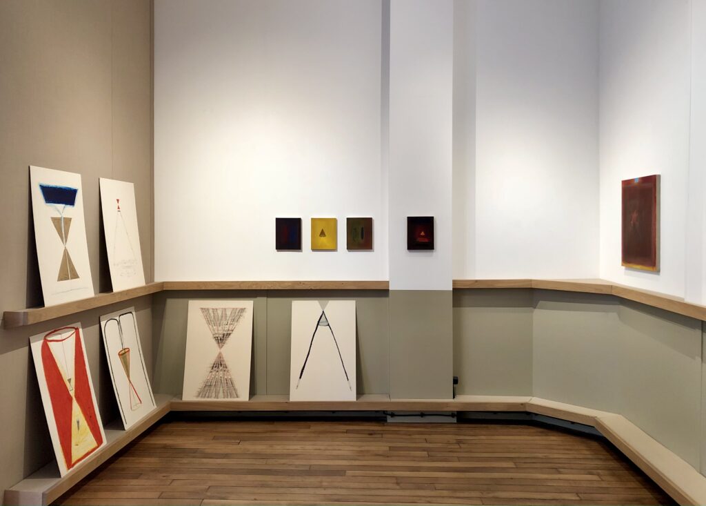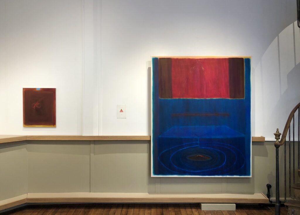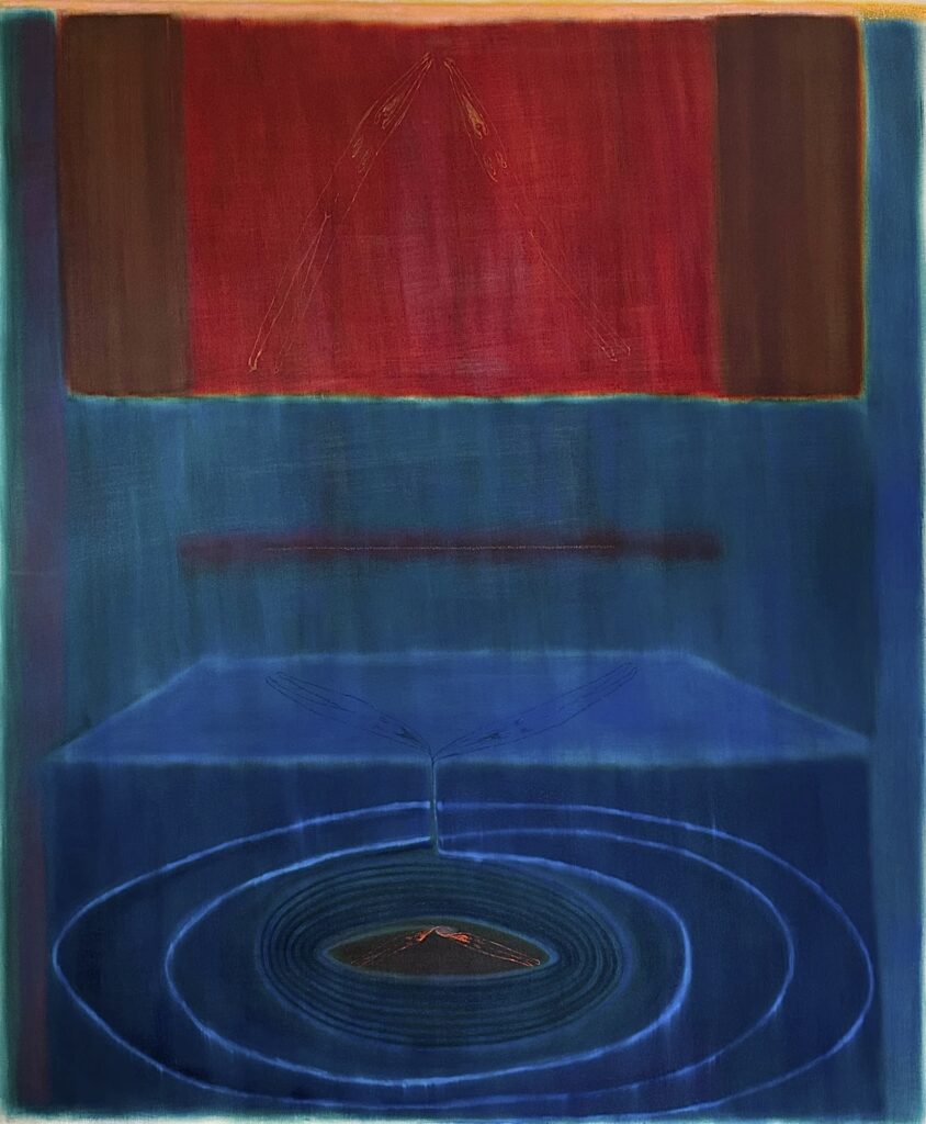 Situated at the crossroads of abstraction and figuration, her poetic language draws as much from color field painting as from transcendentalism, symbolism, or surrealism. Areas of colors, gradients, and successive layers of color compose dense and deep spaces in which Jacox suspends obsessive forms — ellipses, triangles, hourglasses, tables, black holes, levitating bodies. These are not symbols in the strict sense, but open, intuitive metaphors, imbued with personal charge. “Simple shapes have a huge influence on the ways in which the work changes. I am not entirely sure how new forms come into the work, often they come in quietly through a drawing or a small painting; and when they catch I become a bit obsessed with painting the form over and over, as well as finding it involved in my day-to-day life.”