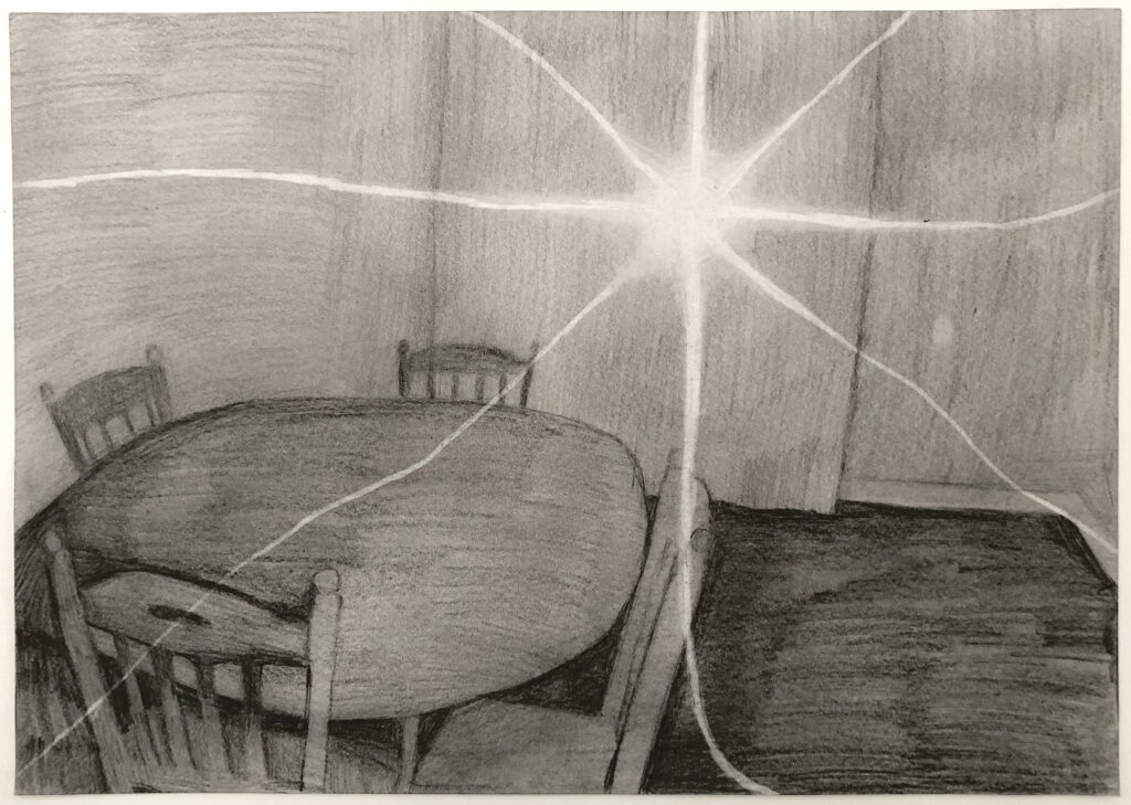 Si Franziska Krumbachner puise dans les épreuves vécues l’essentiel de sa matière, elle s’appuie aussi sur des photographies personnelles ou des images qu’elle glane sur internet. L’artiste y trouve une attache, un point de départ pour développer ensuite une vision affranchie de son modèle, voire du réel. Bien qu’il soit fondé sur un dessin précis et minutieux, son travail rompt en effet avec le réalisme. En témoigne ces étranges rayons de lumière qui éclatent en direction du regardeur, soulignant l’importance symbolique d’un lieu ou d’un objet. Ou bien cette technique qui consiste à gratter et frotter la peinture, notamment dans les compositions peintes en grisaille. Plus significatif encore, l’artiste a développé une pratique expérimentale du collage numérique dont les compositions hybrides sont ensuite transposées sur toile. Au moyen de délicats jeux de transparence, elle superpose ainsi des éléments hétéroclites, traduisant la sédimentation complexe de la mémoire et la coexistence de différentes temporalités, différentes réalités, dans un même espace mental.
